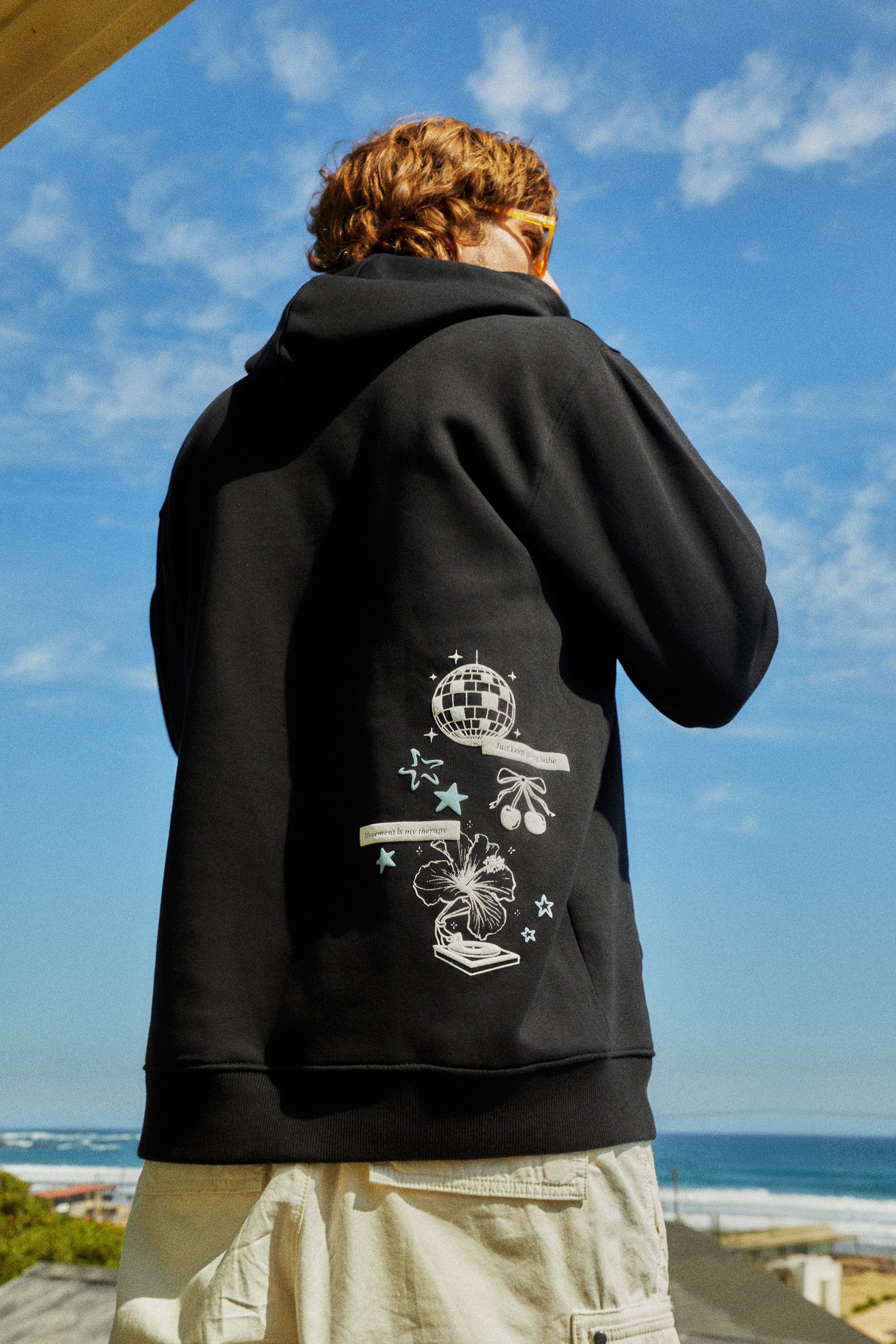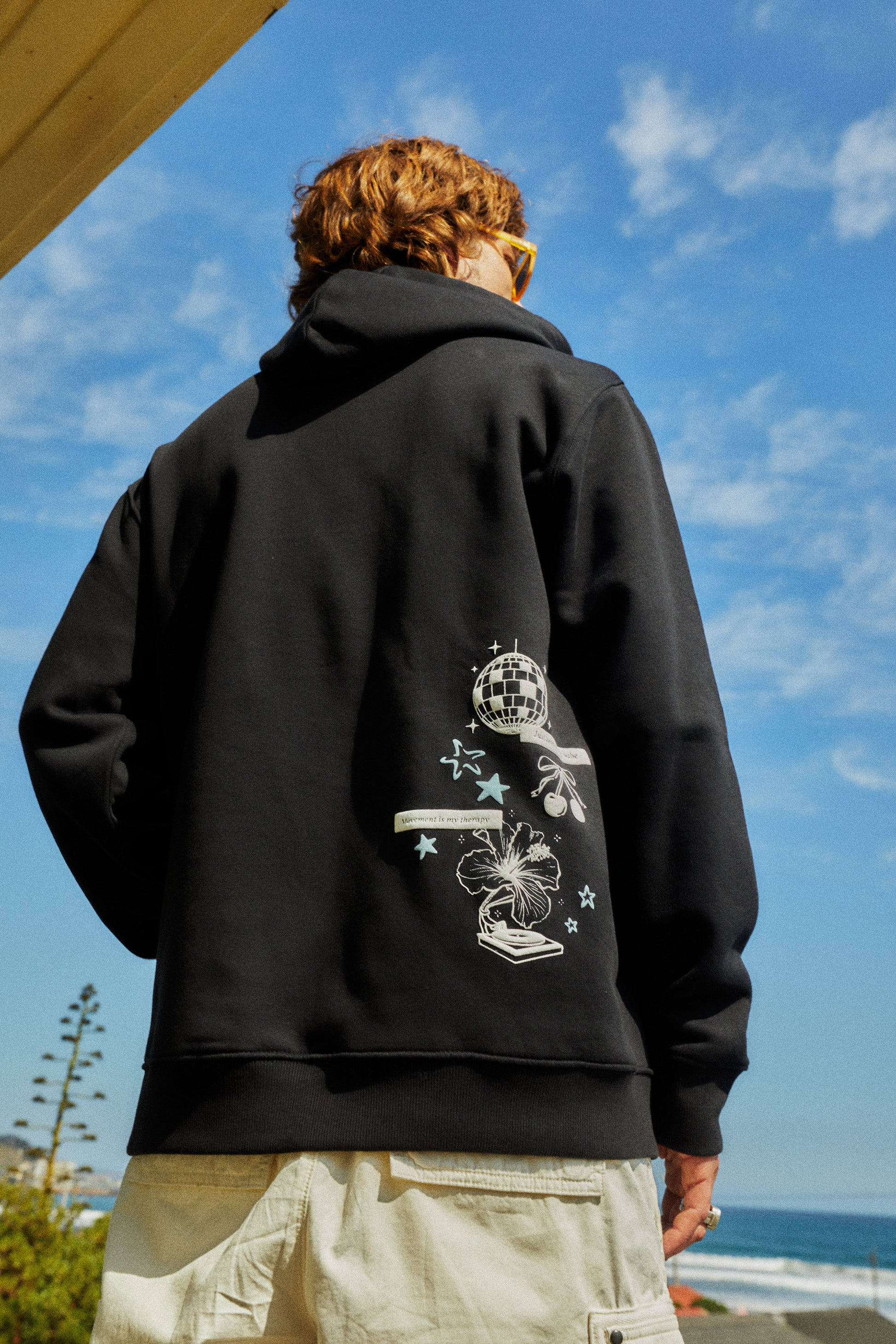 Poleron color negro con estampado blanco y celeste, perfecto para complementar con lo que tú quieras.