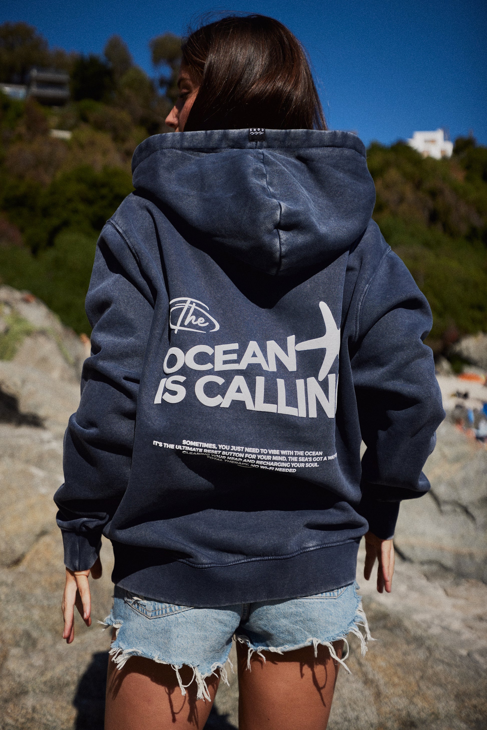 El mar nunca pasa de moda. Este hoodie azul acid wash te invita a dejar atrás todo y responder a la llamada del océano. Con el mensaje “THE OCEAN IS CALLING”, acompañado de una reflexión sobre la calma y la paz que solo el mar puede ofrecer, es el recordatorio perfecto de que lo mejor está allá afuera, sin necesidad de Wi-Fi.