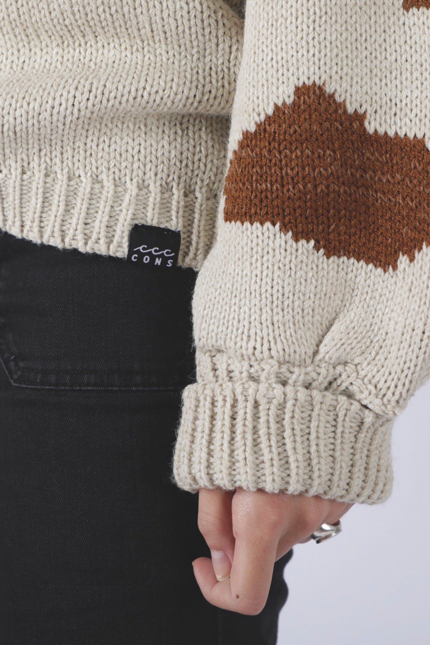 Muuuuuy en tendencia 🐄 Este sweater de lana color crudo con mangas manchadas estilo vaca es tan cozy como cool. Ideal para quienes siguen la moda sin renunciar a la comodidad.